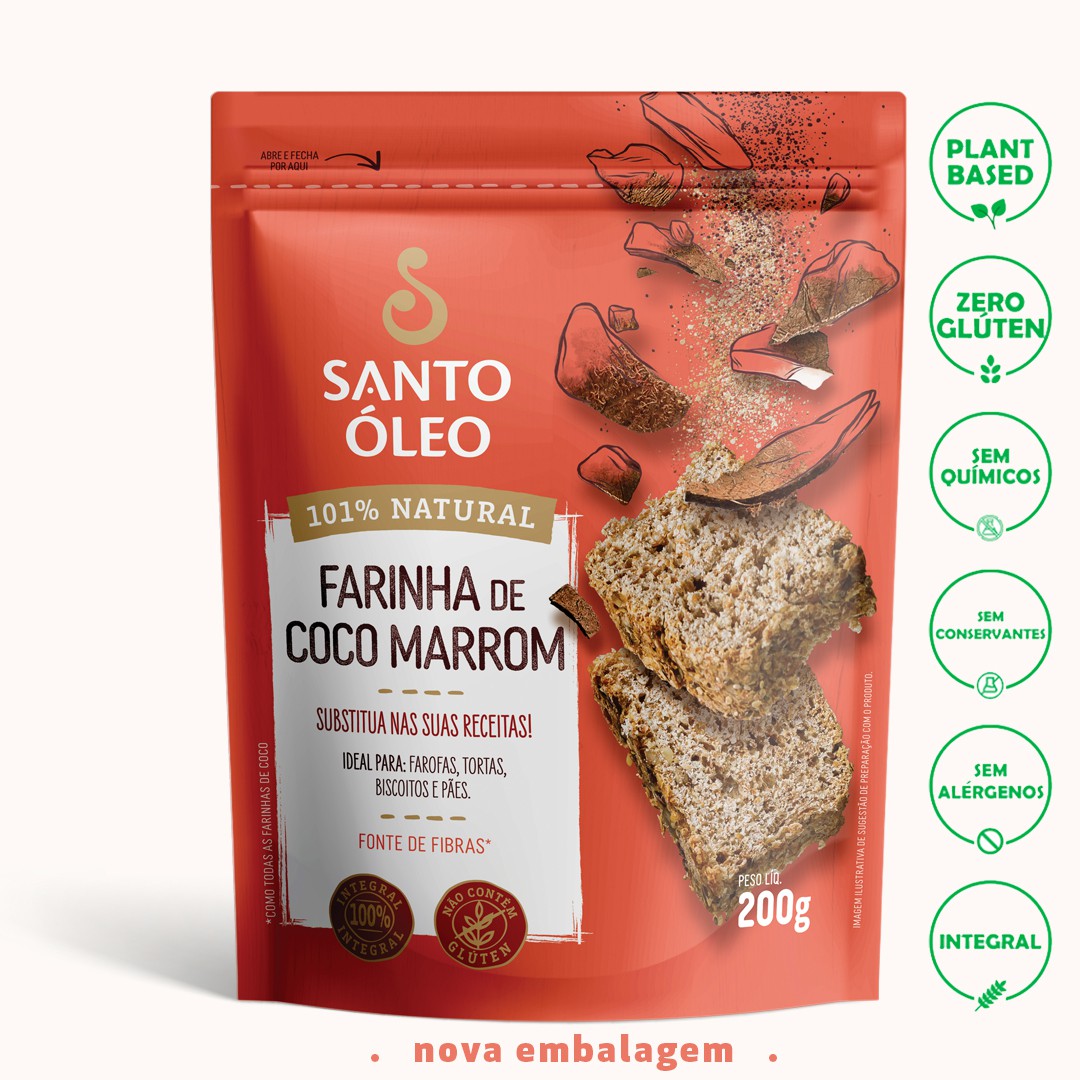 | A Farinha de Coco Marrom é derivada do processamento do óleo de coco extravirgem que é extraído da película do coco (aquela parte marrom que fica grudada na polpa branca), além de nutritiva e livre de glúten, é fonte de fibras e nutrientes.