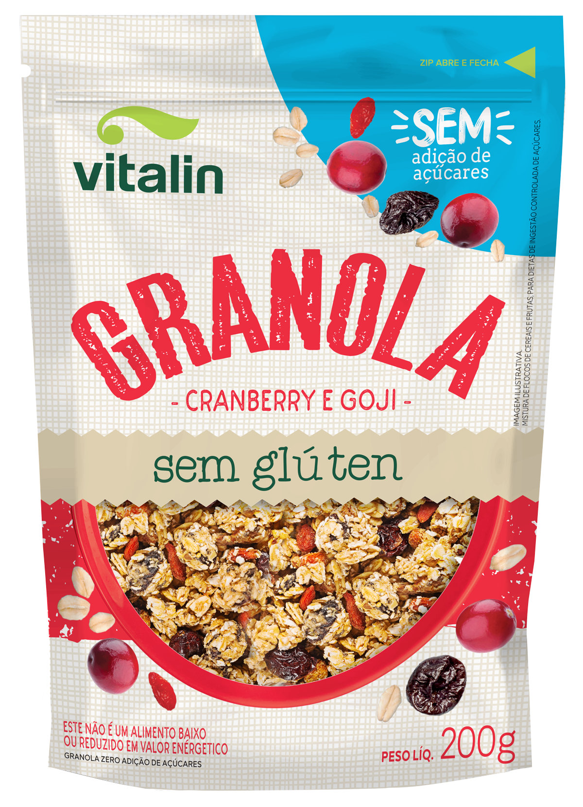 INGREDIENTES: Aveia em flocos sem glúten, farinha de arroz, cranberry, uva passa, goji berry, semente de linhaça, semente de chia, quinoa, canela em pó, sal marinho, edulcorantes naturais maltitol e glicosídeo de esteviol.