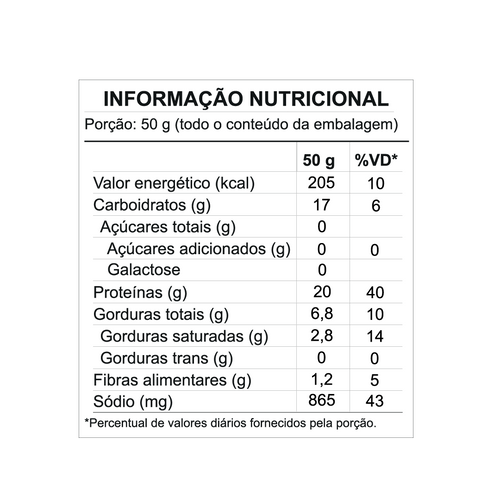 Proteína de ervilha, farinha de mandioca tipo 1 (Zaya Flour), óleo de coco palmiste, colágeno hidrolisado, sal, extrato de levedura, cúrcuma em pó, condimento sabor queijo, aromatizante e emulsificante goma xantana."