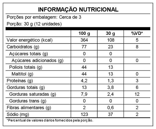 Ingredientes: cobertura sabor chocolate branco (gordura vegetal, leite de arroz em pó, leite de coco em pó, farinha de banana, sal, edulcorantes: maltitol e polidextrose, emulsificante: lecitina de girassol e aromatizantes), maltitol, fécula de mandioca, farinha de mandioca tipo 1 Zaya, cacau em pó, gordura vegetal, massa de cacau, estabilizantes: goma xantana, goma acácia e bicarbonato de sódio, aromatizante e edulcorantes: glicosídeos de esteviol e taumatina.